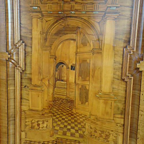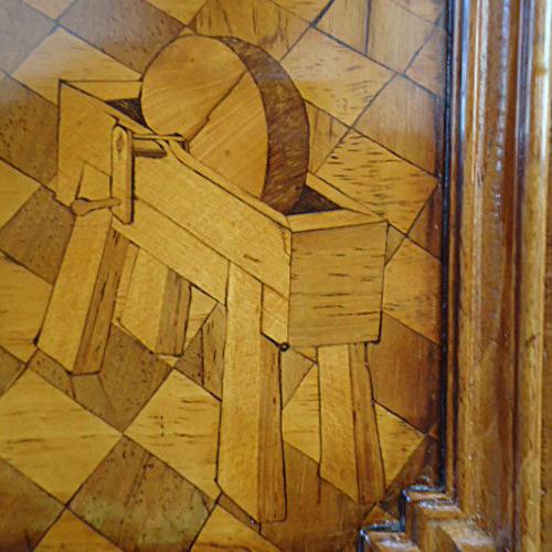 mit Intarsien- und Marketerietechniken verschiedenster Materialien gestaltet und